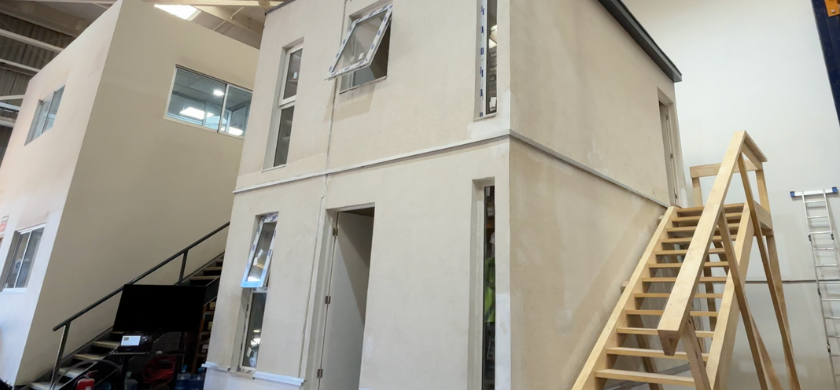 El prototipo, compuesto por cuatro módulos prefabricados de dos pisos, fue fabricado en taller y trasladado a las instalaciones (bodegas) de Simpson Strong Tie Chile en San Bernardo, Santiago, donde la constructora Árbol Ingeniería y Construcción estuvo a cargo del montaje junto a arquitectos, ingenieros, proveedores y equipos de transporte.